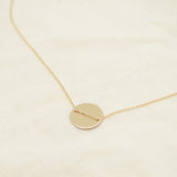 An understated gold circle pendant necklace that looks great on its own or layered. The chain threaded through the pendant detail adds an unparalleled touch to the necklace.